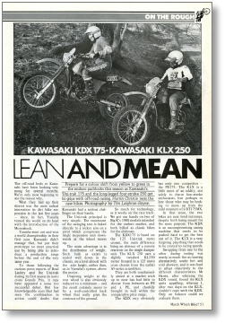 ‘Lean and Mean’ is how Which Bike described the KLX250 in this 1980 shoot out with the KDX175. Click on the cover to download the 6 page road test.